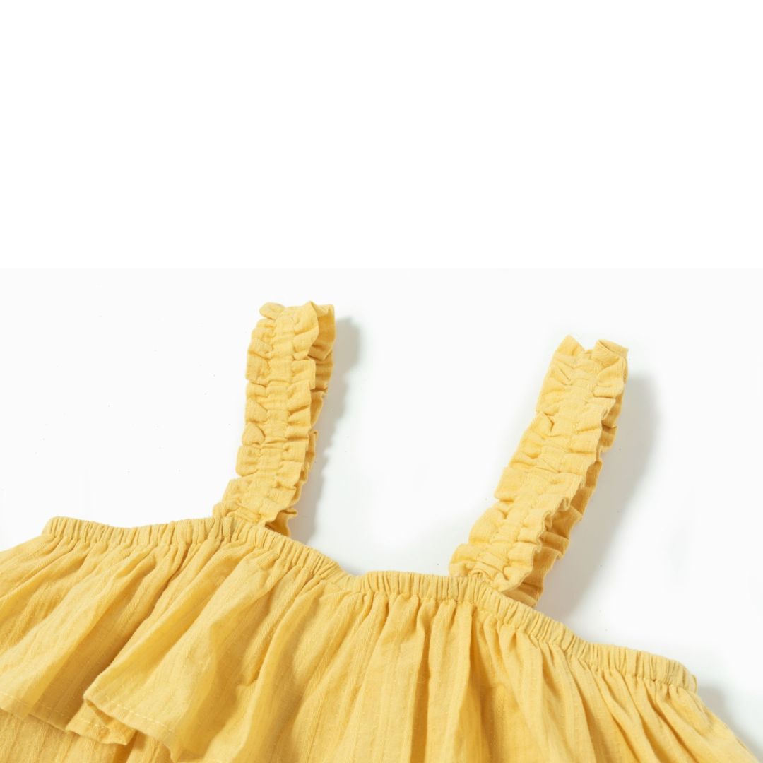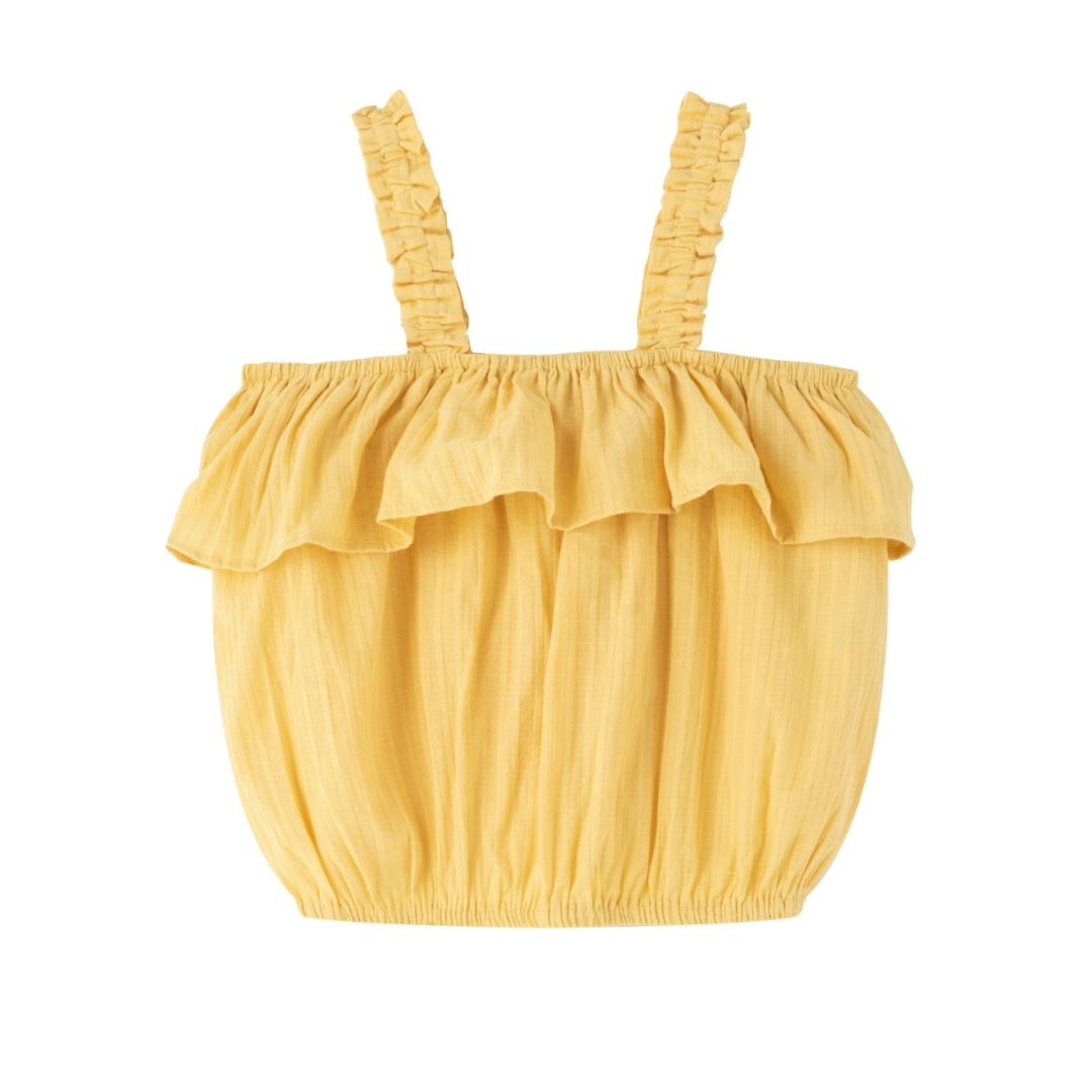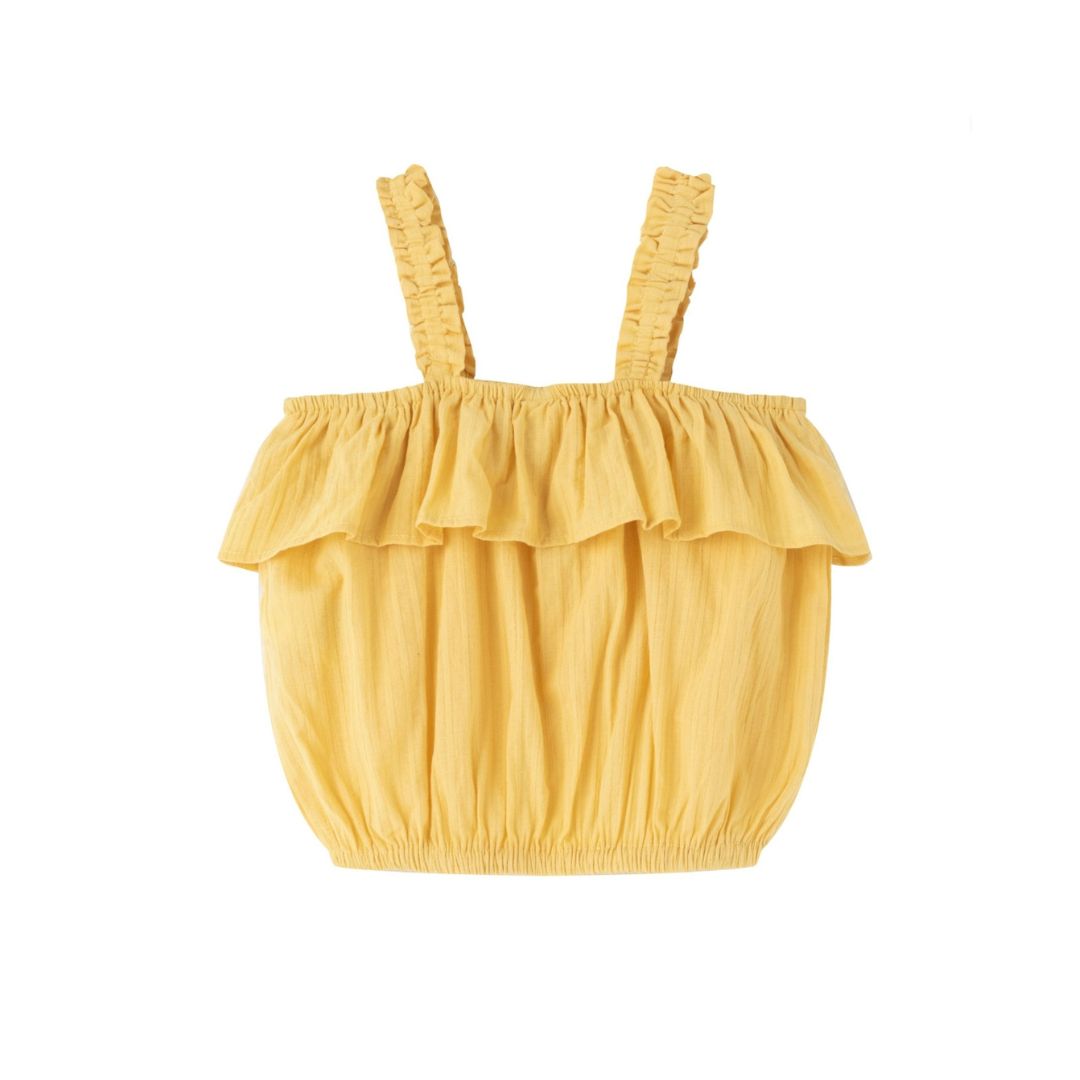 ¡Ilumina el armario de tu pequeña con esta adorable blusa de tirantes para niña ! Confeccionada en un tejido 100% algodón ligero y transpirable, esta blusa es perfecta para mantener a tu hija fresca y cómoda durante los días cálidos. Su diseño sencillo y elegante presenta un corte moderno con tirantes y un delicado volante en el pecho, lo que le da un toque femenino y divertido.