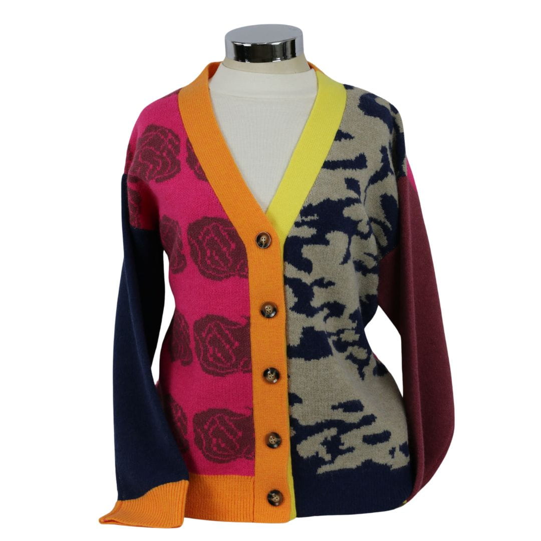 Esta chaqueta destaca por su diseño atrevido y original. En un lado, flores oscuras sobre un fondo rosa añaden un toque romántico, mientras que en el otro lado, trazos en azul oscuro sobre un fondo gris aportan un aire moderno y artístico. Las mangas, una en azul marino con puño naranja y la otra en burdeos con puño amarillo, completan este diseño lleno de contraste y creatividad.