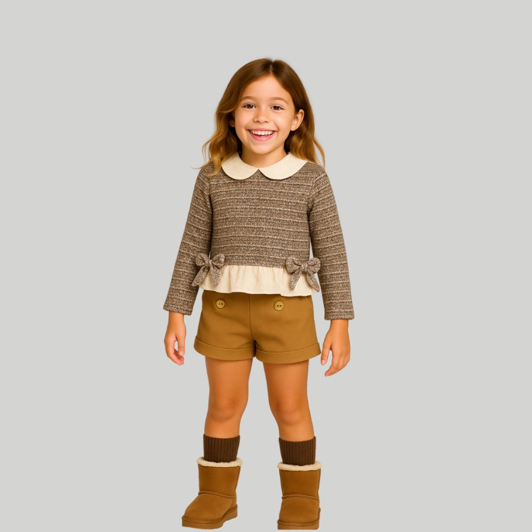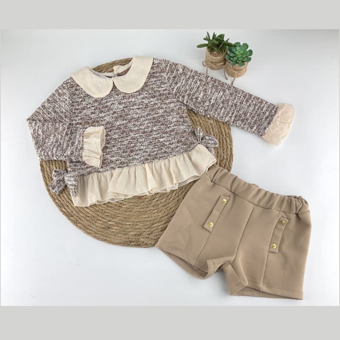 Es un conjunto de niña compuesto por un suéter de un tejido con elasticidad muy suave que no es grueso , en tono en beige, negros y tejido de lurex en tono cobre, que lo hace un conjunto muy elegante. El cuello y los volantes del suéter y la manga es en tejido pluméti y lleva dos lazos en los laterales del tejido del suéter.