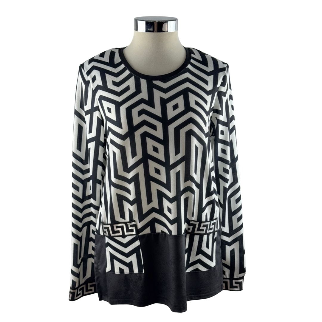 El diseño con un patrón geométrico que cubre la mayor parte de la prenda, mientras que un bloque de color negro en el bajo añade un toque de contraste y equilibrio visual. El corte clásico de cuello redondo y manga larga lo convierte en una opción versátil para diversas ocasiones, desde un evento casual hasta una salida más formal.