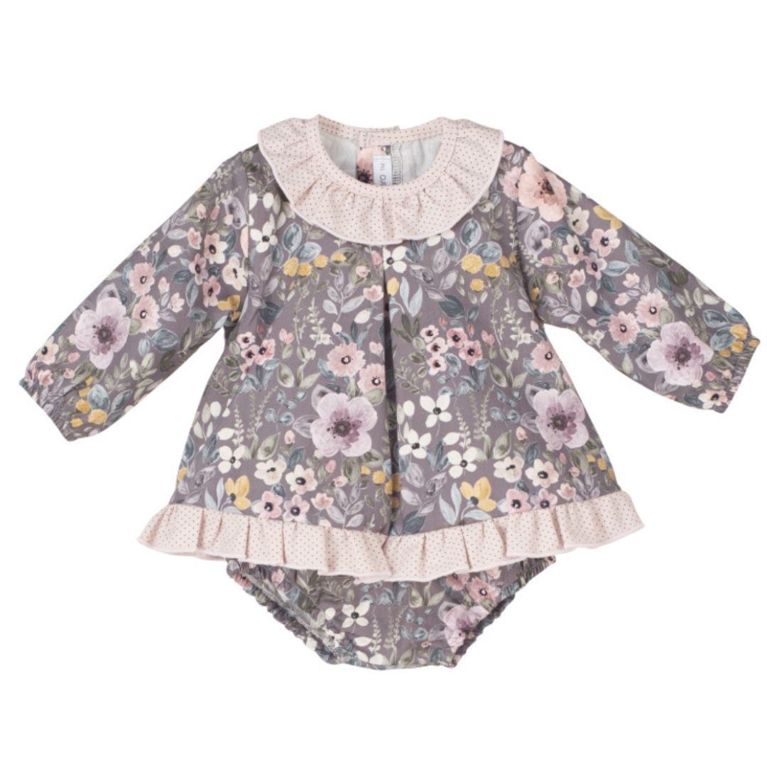 Este encantador jesusito para bebé de la prestigiosa firma Calamaro es una prenda delicada y llena de encanto. Confeccionado en 100% algodón suave y transpirable, asegura la comodidad del bebé en todo momento. El estampado floral en tonos grises y rosados, combinado con toques de amarillo y blanco, crea un diseño dulce y campestre. El corte evasé del jesusito permite libertad de movimiento, mientras que el cuello y el bajo adornados con un volante de encaje en color crema añaden un toque romántico y sofisticado. Incluye una braguita a juego, también en el mismo estampado floral, para completar el conjunto. Ideal para ocasiones especiales o para vestir a tu bebé con un estilo dulce y elegante en el día a día.