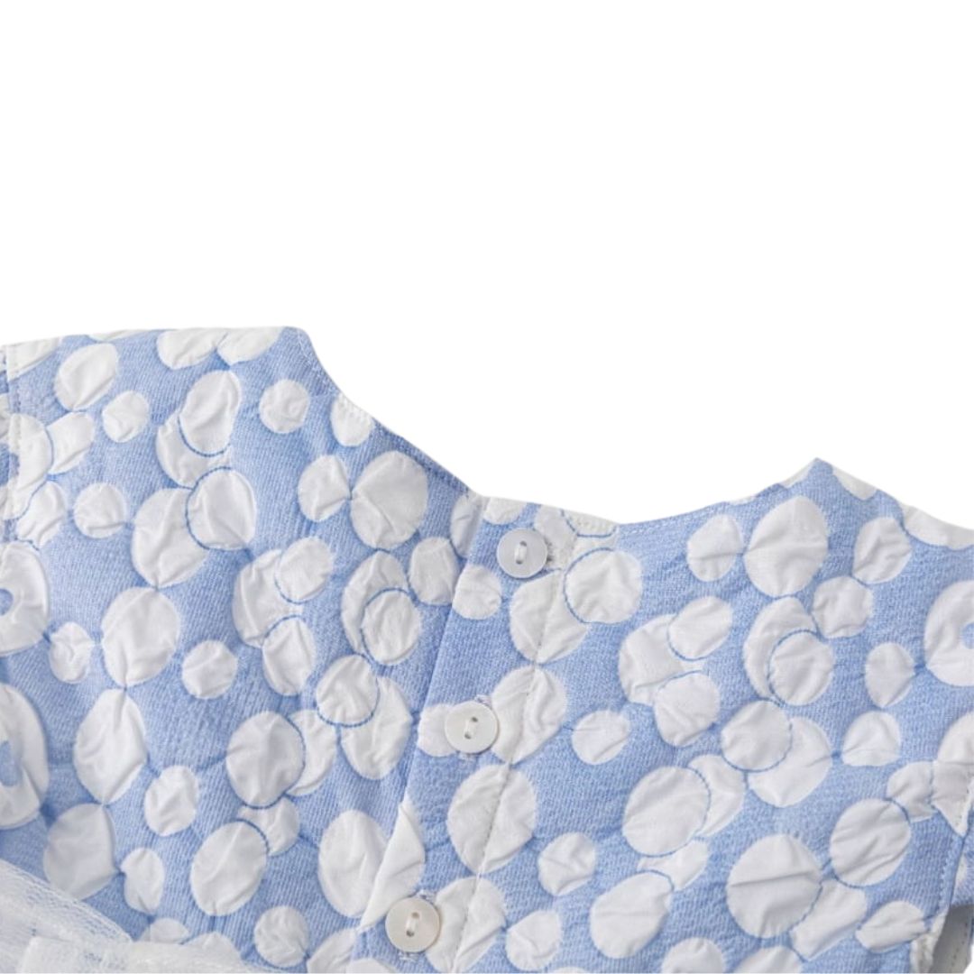 Este adorable vestido para bebé niña es perfecto para los días de verano o cualquier ocasión especial. Confeccionado en poliéster 100%, presenta un ligero y cómodo tejido decorado con un encantador estampado floral en tonos azul y blanco. El corte del vestido es clásico, con un canesú delicado y una falda fruncida que le da volumen y un aire dulce. Las mangas cortas y sutilmente abullonadas añaden un toque de sofisticación.