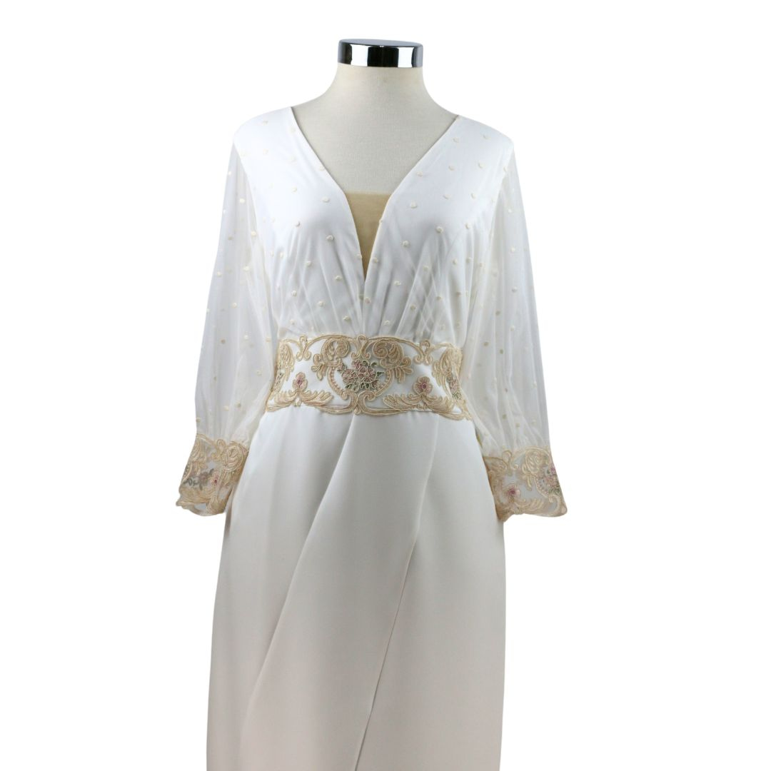 Luce radiante en tu gran día con este impresionante vestido de novia con encaje . Su diseño atemporal, con un favorecedor escote en V y una cintura acentuada con un delicado cinturón de encaje, te hará sentir segura y elegante. Confeccionado con una suave mezcla de 94% poliéster y 6% spandex, este vestido te ofrecerá la comodidad que necesitas para disfrutar al máximo de tu boda. La ligera elasticidad del tejido se adapta a tu figura para un ajuste perfecto y un movimiento fluido. La abertura en la pierna añade un toque moderno y sofisticado. Un vestido de novia económico pero a la altura , no te defraudará.